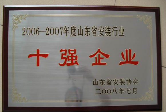 集團(tuán)公司榮獲“2006-2007年度山東省安裝行業(yè)十強企業(yè)”稱號 近日,山東省安裝協(xié)會發(fā)布文件,公布2006-2007年度山東省安裝行業(yè)十強企業(yè)和九家優(yōu)秀企業(yè)。集團(tuán)公司榮膺十強企業(yè)。安裝行業(yè)十強企業(yè)和優(yōu)秀企業(yè)的評選是根據(jù)《山東省優(yōu)秀暨十強安裝企業(yè)評選辦法》,經(jīng)專家評審、會長辦公會研究決定的。榮膺該項榮譽也是集團(tuán)公司總體實力的反映。(08.09.16) |