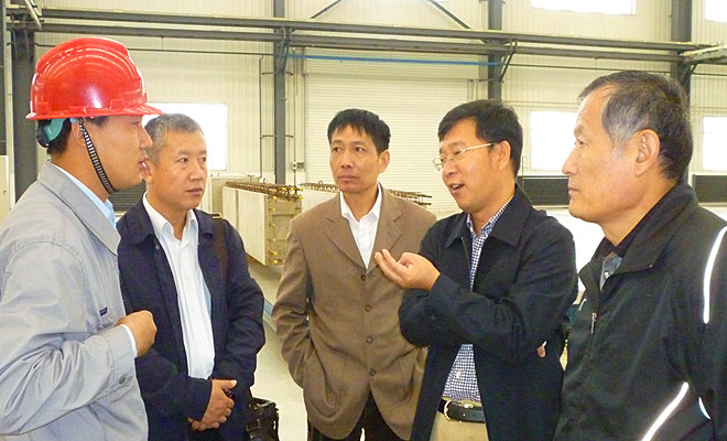 上圖為徐鵬強(qiáng)董事長(zhǎng)(右二)在沈陽(yáng)工業(yè)化部品生產(chǎn)車(chē)間與車(chē)間負(fù)責(zé)人交流