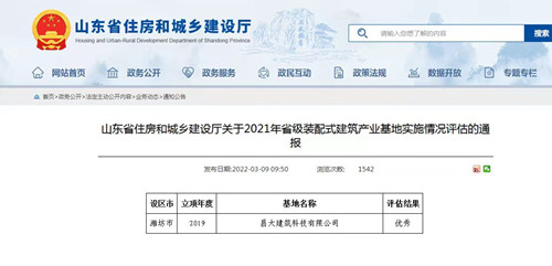 近日,山東省住建廳發(fā)布了《山東省住房和城鄉(xiāng)建設廳關于2021年省級裝配式建筑產業(yè)基地實施情況評估的通報》。山東省共有121家產業(yè)基地通過評估,其中,省級現(xiàn)場評估的44家產業(yè)基地中,昌大建筑科技有限公司等12家產業(yè)基地評估結果為“優(yōu)秀”。