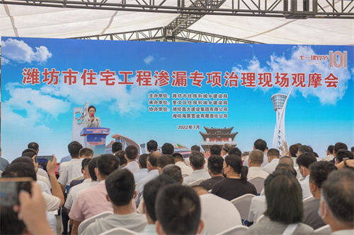2022年7月1日上午,由濰坊市住建局組織的“濰坊市住宅工程滲漏專項(xiàng)治理”觀摩會(huì)在集團(tuán)二建公司總承包施工的海通恒信·鳶都名筑項(xiàng)目現(xiàn)場(chǎng)舉行。