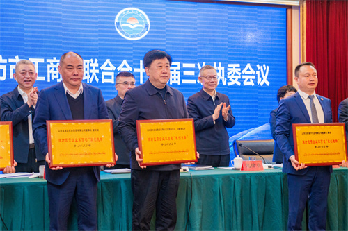 2024年3月22日上午,濰坊市工商聯(lián)十三屆三次執(zhí)委會(huì)在金茂國際大酒店召開。集團(tuán)公司總裁朱九洲出席會(huì)議并作為濰坊民營企業(yè)家百名“敢創(chuàng)先鋒”代表上臺領(lǐng)獎(jiǎng)。
