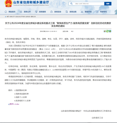 2024年12月6日,2024年度全省住房城鄉(xiāng)建設(shè)系統(tǒng)重點(diǎn)工程“聚焦新質(zhì)生產(chǎn)力服務(wù)高質(zhì)量發(fā)展”創(chuàng)新創(chuàng)優(yōu)勞動(dòng)競(jìng)賽獲獎(jiǎng)名單公布,集團(tuán)公司榮獲優(yōu)勝集體稱號(hào),四建公司的昌威綜合運(yùn)營中心綜合運(yùn)營樓項(xiàng)目部榮獲優(yōu)勝項(xiàng)目部,高春濤榮獲優(yōu)勝個(gè)人。