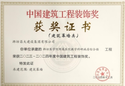 2024年12月10日,中國(guó)建筑裝飾協(xié)會(huì)在北京召開大會(huì),表彰2023~2024年度“中國(guó)建筑工程裝飾獎(jiǎng)”工程。集團(tuán)裝飾幕墻工程公司、山東鳶港裝飾工程有限公司的三項(xiàng)工程榮獲五個(gè)獎(jiǎng)項(xiàng):濰坊醫(yī)學(xué)院附屬醫(yī)院教學(xué)科研病房綜合樓(建筑幕墻類和幕墻設(shè)計(jì)類)、濰坊市婦女兒童健康中心病房樓(公共建筑裝飾類和公共建筑裝飾設(shè)計(jì)類),柒星國(guó)際2#住宅樓(建筑幕墻類)。